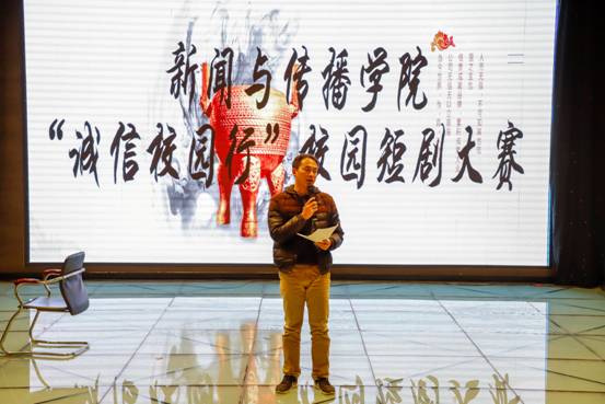 比赛开始,19级编导三班带来的《我们的小世界》拉开了整个活动的序幕,台上人物形象生动,剧本内容具有较强表现力,通过对社会事件的改编达到以小见大的效果,充分彰显“诚信做人”与“诚信为师”的重要性。作品《迷途知返》客观反映了在评选国家助学金当中的真实事件,内容震撼,不断拷问着人物内心和现场观众,引人深思。作品《诈骗风波》充分表现了主人公刘成在父亲重病情况下,误入诈骗组织,最后又被诈骗组织抛弃的故事,舞台表演力强,发人深省。最后,2019级编导一班所表演的《期末来临》内容真实还原员工期末考试情景,笑点不断,从而赢得阵阵掌声,浓浓的东北口音也别具特色,短剧内容突出,具有警示教育作用。表演结束以后,郝晓蒙老师上台对表演者及表演剧本进行点评,首先,他肯定了各表演组在短时间内所付出的努力,并鼓励大家要多在剧本上下功夫,多去发现资助工作中的一些故事和矛盾冲突点,充分展现诚信工作在资助中重要作用。其次,他要求大家要秉持新传院的良好学风,无论在何时何地都要严格要求自己,以高标准完成好各项任务。最后,他对获奖的各个作品表示祝贺,希望他们再接再厉,争取取得更大的进步。