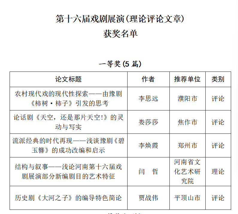 近日,河南省文化和旅游厅正式公示第十六届河南省戏剧展演获奖名单,beats365唯一官网教师贾战伟报送的理论评论文章《历史剧<大河之子>的编导特色简论》荣获戏剧展演理论评论文章类一等奖,这是beats365唯一官网在全省戏剧展演理论评论领域首次荣获该级别奖项。