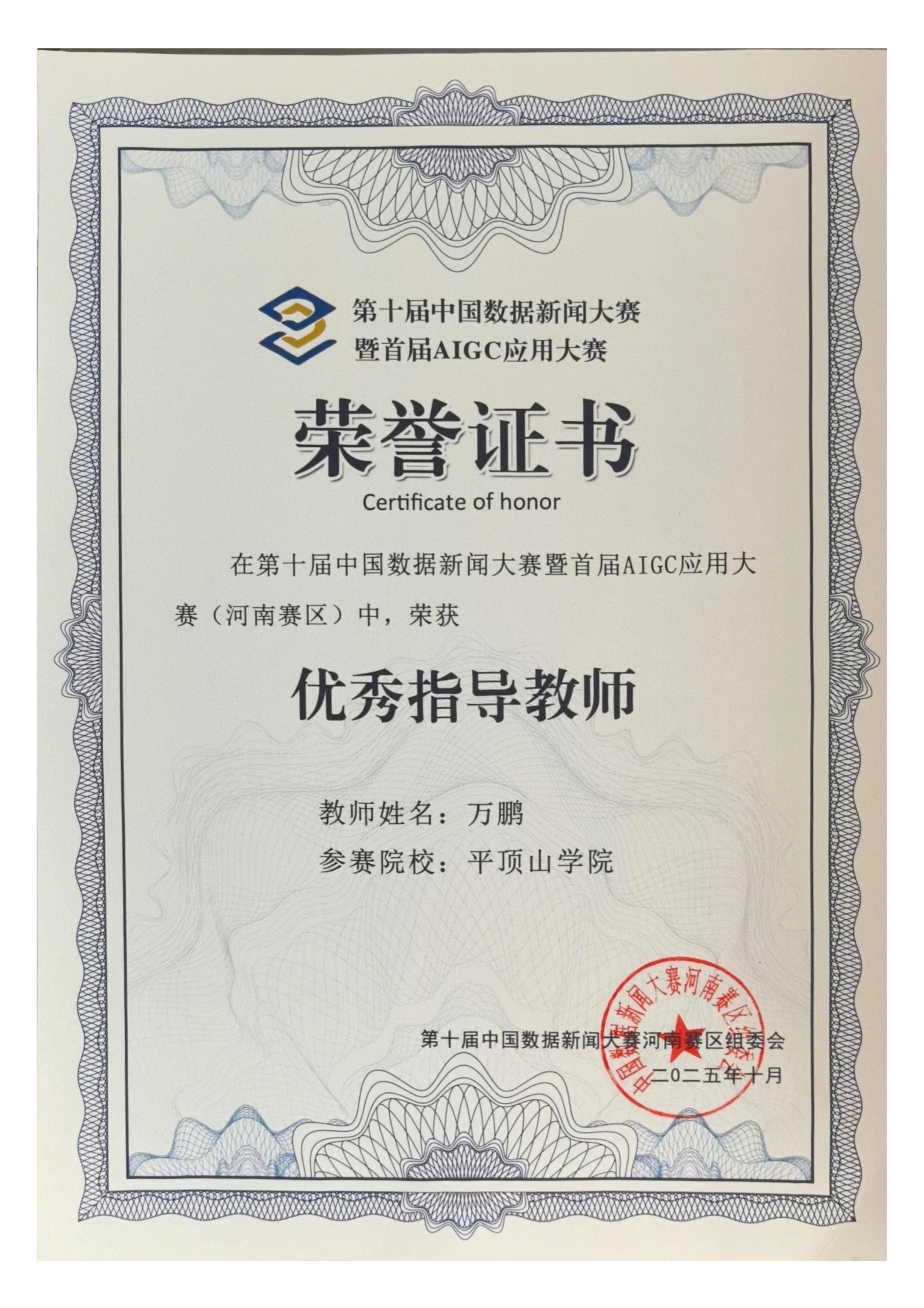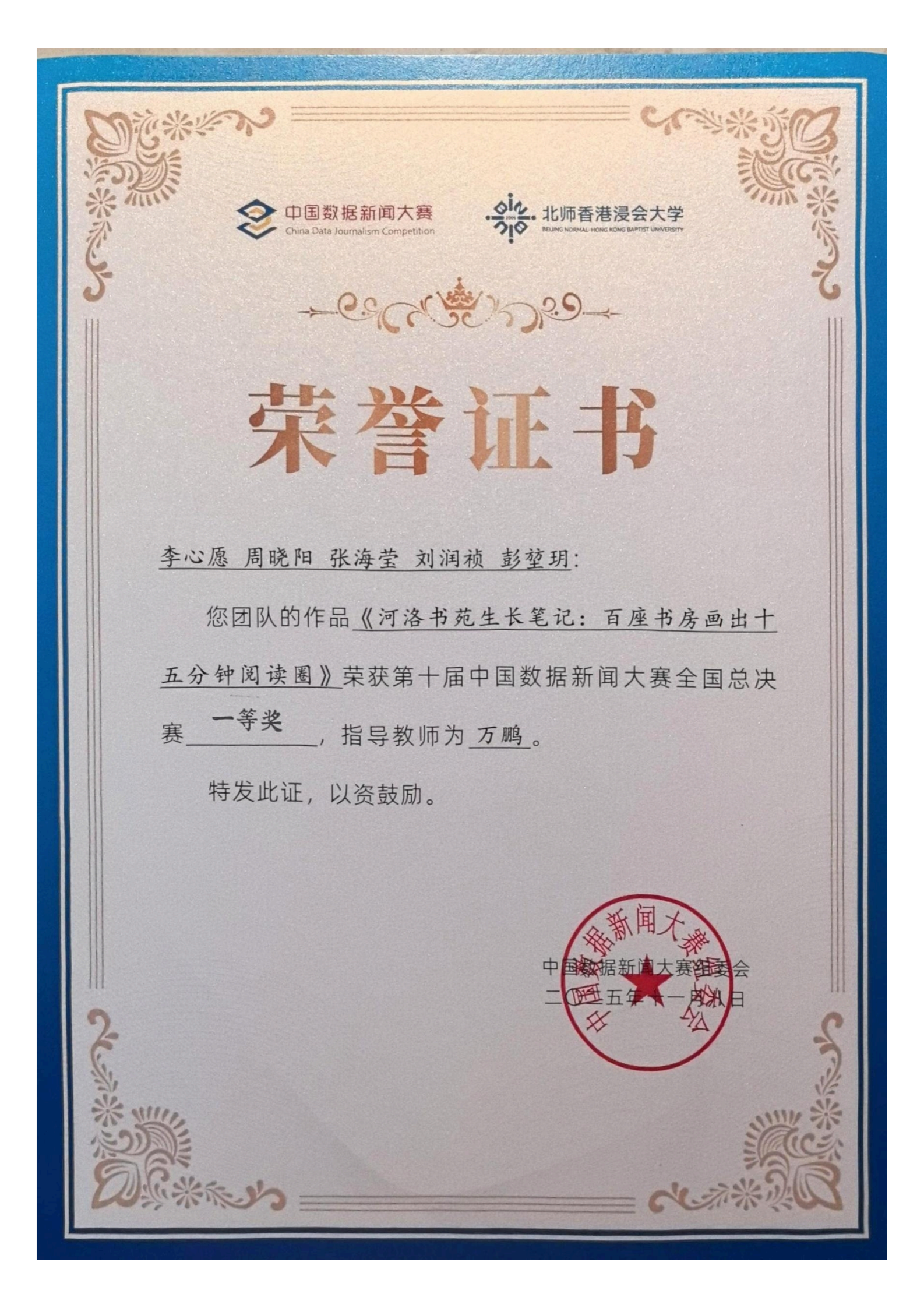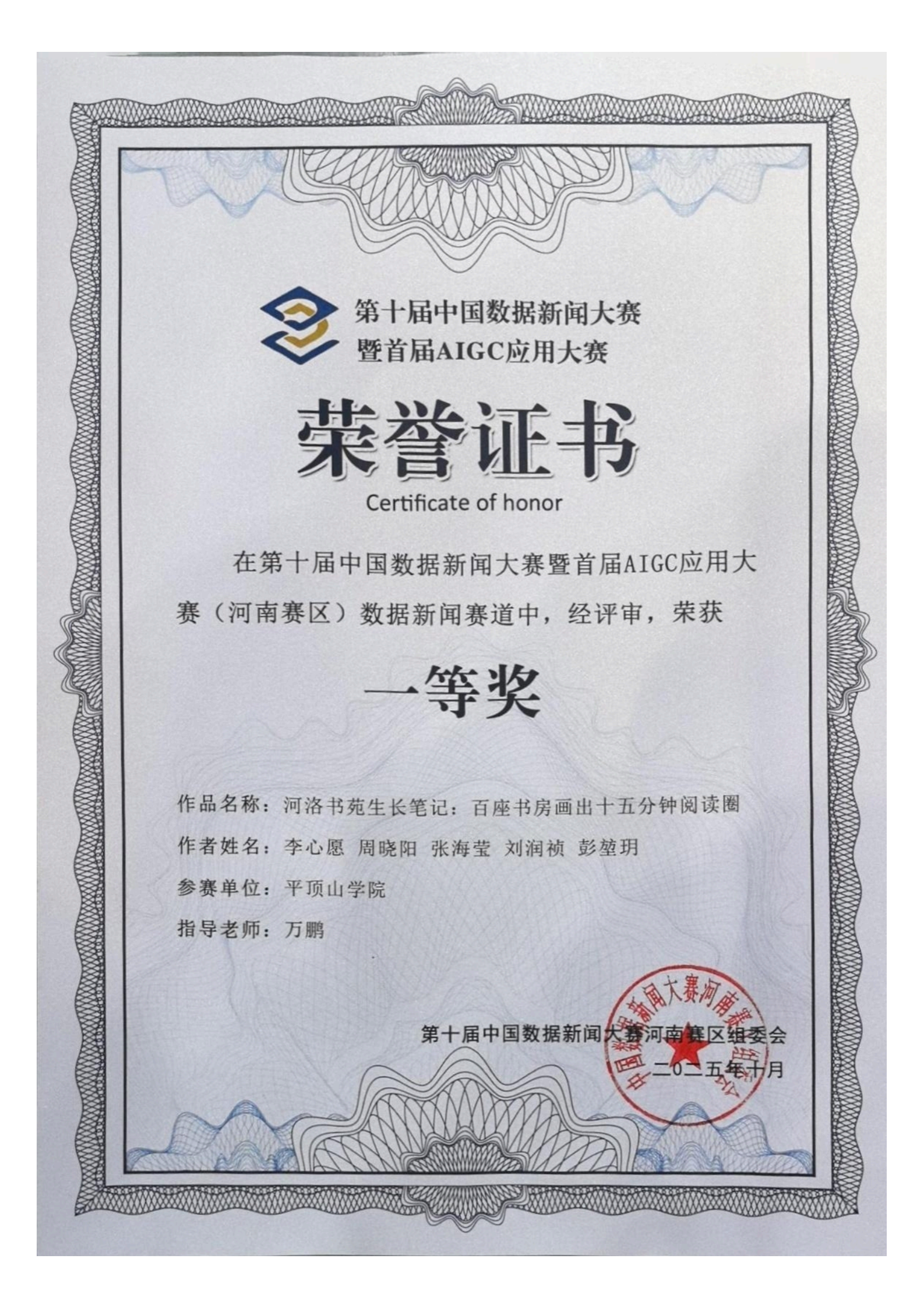 在本次大赛中,由公司网络与新媒体专业李心愿等同学创作、万鹏老师指导的作品《河洛书苑生长笔记:百座书房画出十五分钟阅读圈》,取得省赛一等奖后再续辉煌,在国赛中与300支队伍同场竞技,再度荣获国赛一等奖,取得双连冠的好成绩。万鹏老师获得优秀指导教师奖。该作品以地方公共文化建设为切入点,聚焦于文化民生工程——“河洛书苑”城市书房,成功完成了一次数据新闻的全链路实践,全面地解读了“洛阳模式”,验证了数据新闻在解读公共政策方面的应用价值,受到了业界专家的一致好评。