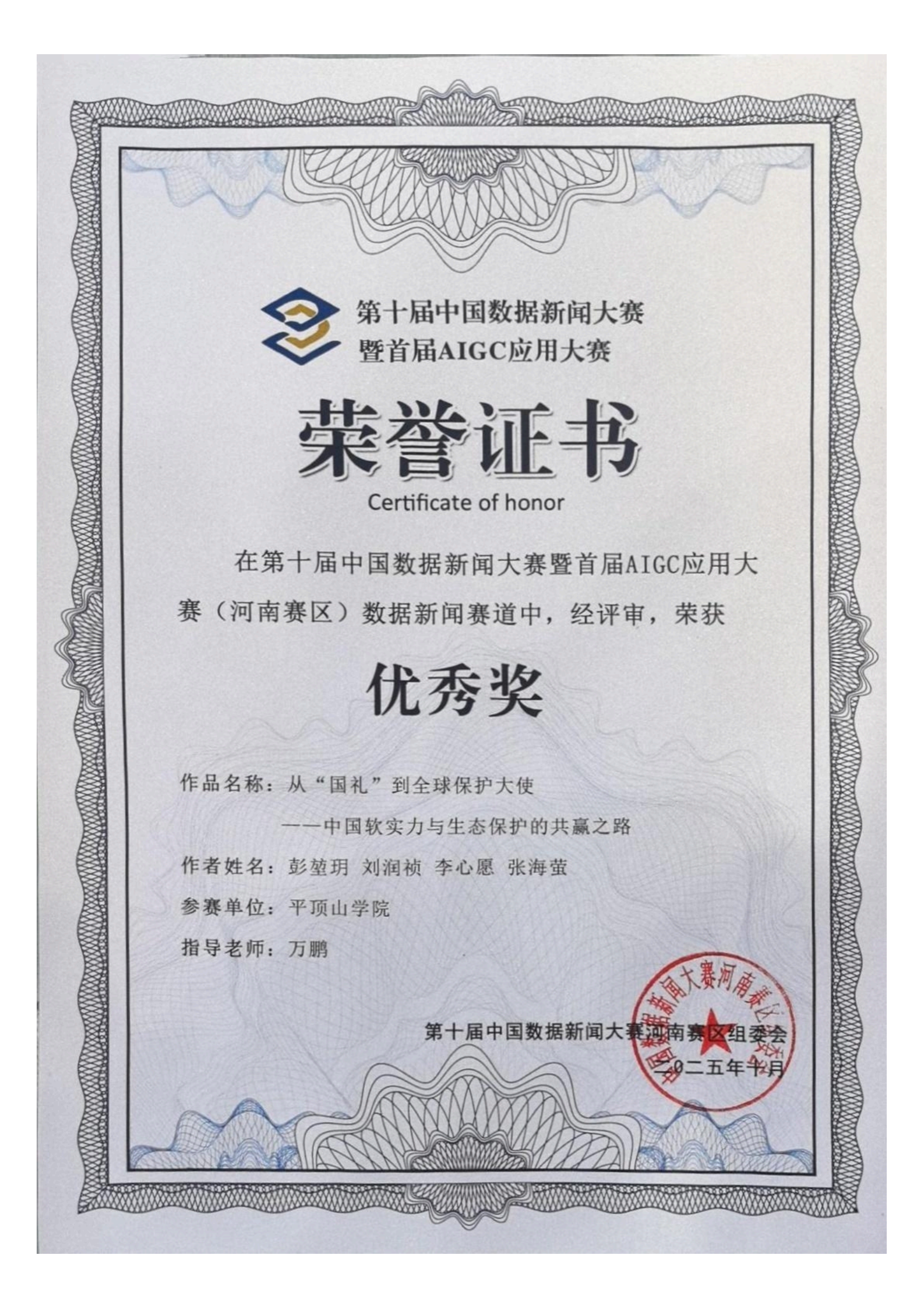 除了该作品外,网络与新媒体专业彭堃玥、刘润祯等同学组成的“云镇兴”团队,凭借《从“国礼”到全球保护大使——中国软实力与生态保护的共赢之路》在本届中国数据新闻大赛河南赛区获得优秀奖,展现了公司学子的扎实功底与创新能力。