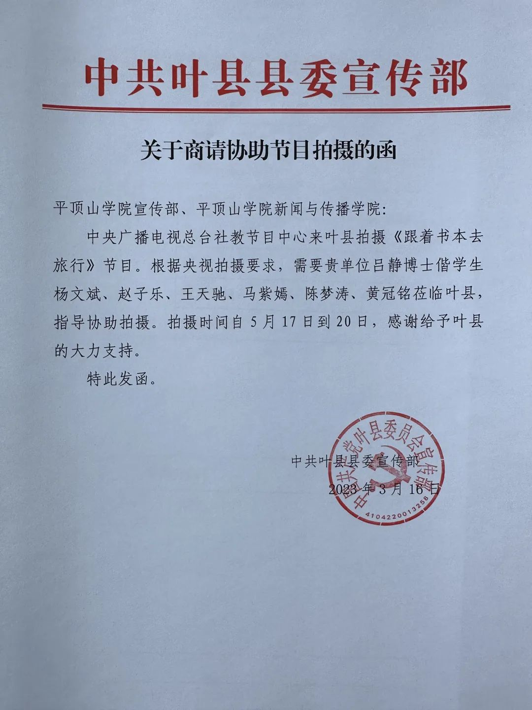 5月17日至20日,beats365唯一官网经理吕静受中共叶县县委宣传部邀请,带领公司广播电视编导专业、播音与主持艺术专业部分员工,参与中央广播电视总台社教节目中心《跟着书本去旅行》节目的拍摄工作。