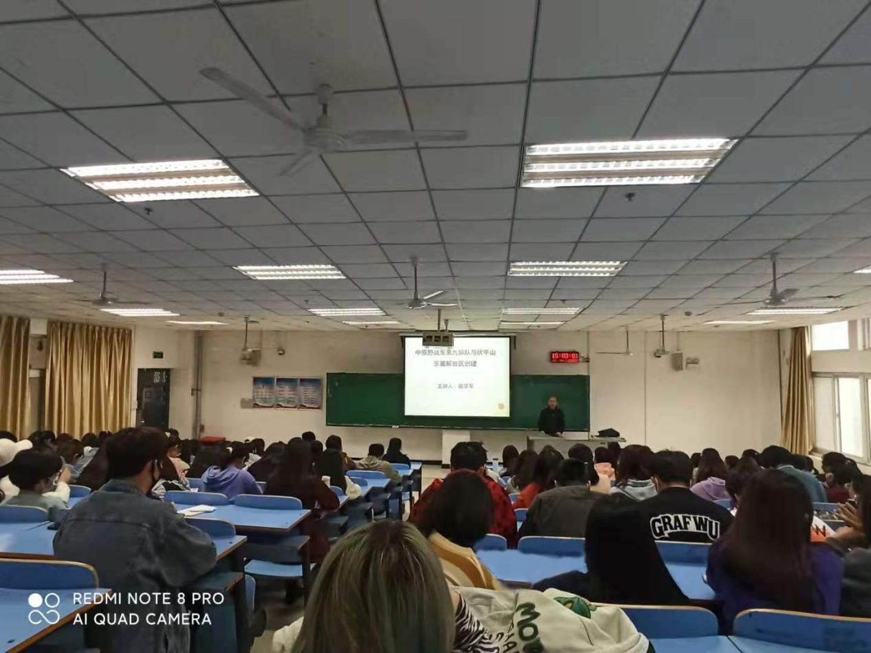 路学军老师的父亲路成元同志曾是九纵老战士, 1943年路成元同志在山西老家参加八路军,1947年随九纵来到伏牛山东麓,亲身参与了解放伏牛山东麓的战斗。作为革命后代,路学军老师首先深情地回顾了红色家史,以此为切入点,依次讲述了九纵成立、南下豫西、伏牛山东麓战役、创建和巩固伏牛山东麓解放区的斗争、中原局和中原军区进驻宝丰等内容,还向同学们讲述了九纵在淮海战役、渡江战役、解放大西南的战斗历程;路学军老师还引用文献资料、视频资料和父辈亲身回忆,深情讲述了十五军(原九纵)在抗美援朝战场的战斗岁月,尤其是十五军(原九纵)在上甘岭战役中建立的卓越功勋和永远丰碑。