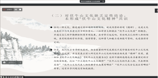 在此次线上讲座中,骆玉安教授首先从“伏牛山文化圈”说开,以更加宽广的视野对伏牛山脉及其周边地区的文明历史和文化脉络进行梳理和研读,提出横亘中原的伏牛山是华夏龙脉的根须,伏牛山有着独特的山水人文,许多中原儿女对伏牛山都有着一种难以割舍的地域情怀。作为有担当的文化学者,满腔热情拥抱新时代,科学梳理伏牛山文脉,创新和打造以黄河文明和中原文化为标志的沿伏牛山生态文化走廊,具有重要的现实意义和长远的战略意义。