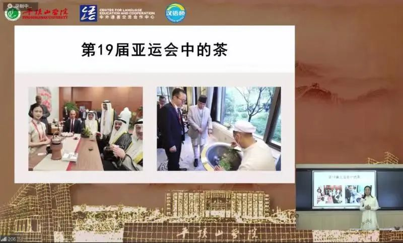 课程《长寿之乡:古法烹茶》以杭州亚运会为切入点,引出中国茶的种类,然后向同学们介绍了中国历史悠久,博大精深的烹茶文化。授课教师从认识茶叶、烹茶历史、感受茶道三方面出发,向同学们展示了中国人对生活品质和精神追求的向往。在课堂互动环节,同学们纷纷提到自己经常喝的茶并对中国茶赞不绝口,对中国烹茶文化产生了极大的兴趣。此次课程加深了他们对中国烹茶文化的理解,也为他们带来了一次独特的文化交流体验。
