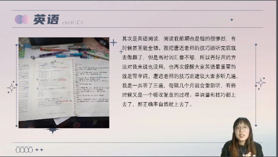 郑若一同学以《想象,体会,然后成为》为题,从“学习方法”“各科安排”“总结及答疑”三个方面细致地为大家分享自己考研的经验。