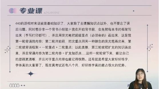 郑若一同学根据自己对于考研学习的实践细致地为同学们讲解了背书的经验,首先要重点理解知识点,并列出背诵框架,然后根据框架有一个清晰的思路联系到具体的知识点,不断扩充知识面,随后,郑若一同学又着重分析了关于政治、英语、专业课该如何复习,指出了政治选择题的重要性以及英语词汇量与阅读技巧联系的必要性,她强调学习的效率与方法的结合,建议同学们在备战过程中保持积极的心态,及时复盘与总结,在平时的练习中注意书写以及时间的把握。