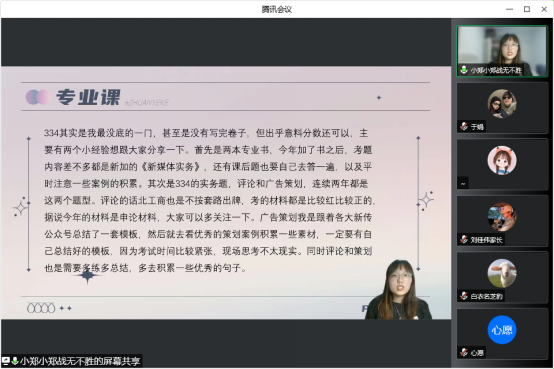 为贯彻落实习近平总书记关于教育的重要论述,全面贯彻党的教育方针,牢牢扭住落实立德树人根本任务,聚焦能力大提升,作风大转变。根据公司党委安排,公司积极开展提能力·转作风系列活动。5月3日晚7时30分,beats365唯一官网在线上开展的“树立信心·我为同学办实事”活动——《闻新讲堂》活动。本次课堂主讲由2022年成功考取北京工商大学研究生的18级网络与新媒体专业的郑若一同学为大家传授考研经验,公司有考研意愿的同学参加了此次授课。