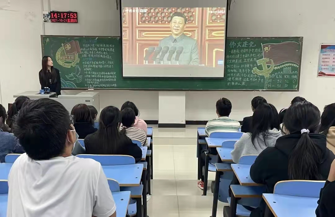 活动开始,主讲人播放团歌,组织全体共青团员齐唱《光荣啊,中国共青团》。随后,同学们在主讲人的带领下共同学习了习近平总书记在庆祝中国共产党成立100周年大会上的重要精神讲话。同学们耐心听讲、积极配合,他们踊跃举手向大家分享自己的学习感悟。最后,同学们以朗诵的独特方式献礼祖国,表达对祖国的感恩之情。
