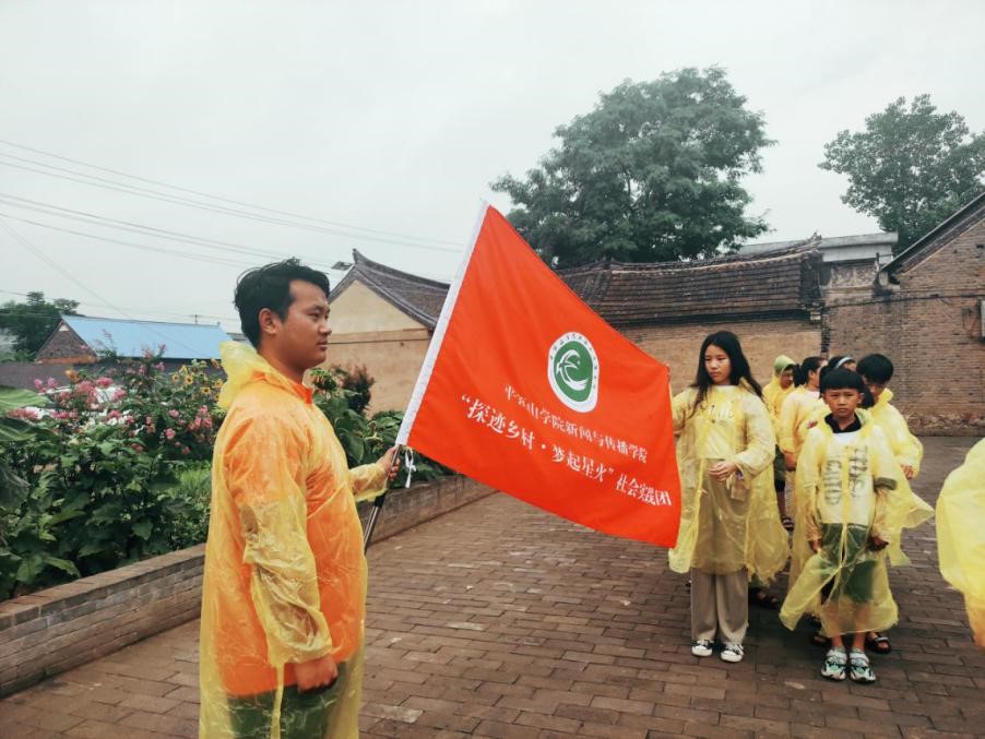 随后领导和老师们同暑期实践团的爱心帮扶组成员一起,带领孩子们前往中原军区司令部旧址进行课外实践活动。小朋友们排着整齐的队伍,身穿黄色雨衣,边走边唱《歌唱祖国》,嘹亮的歌声吸引了过往村民们的目光。