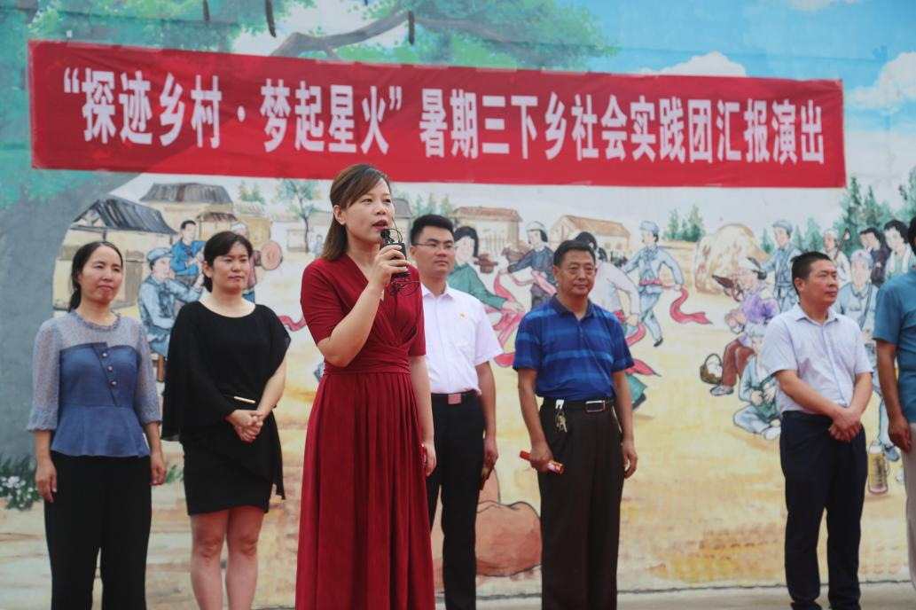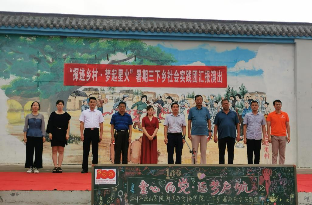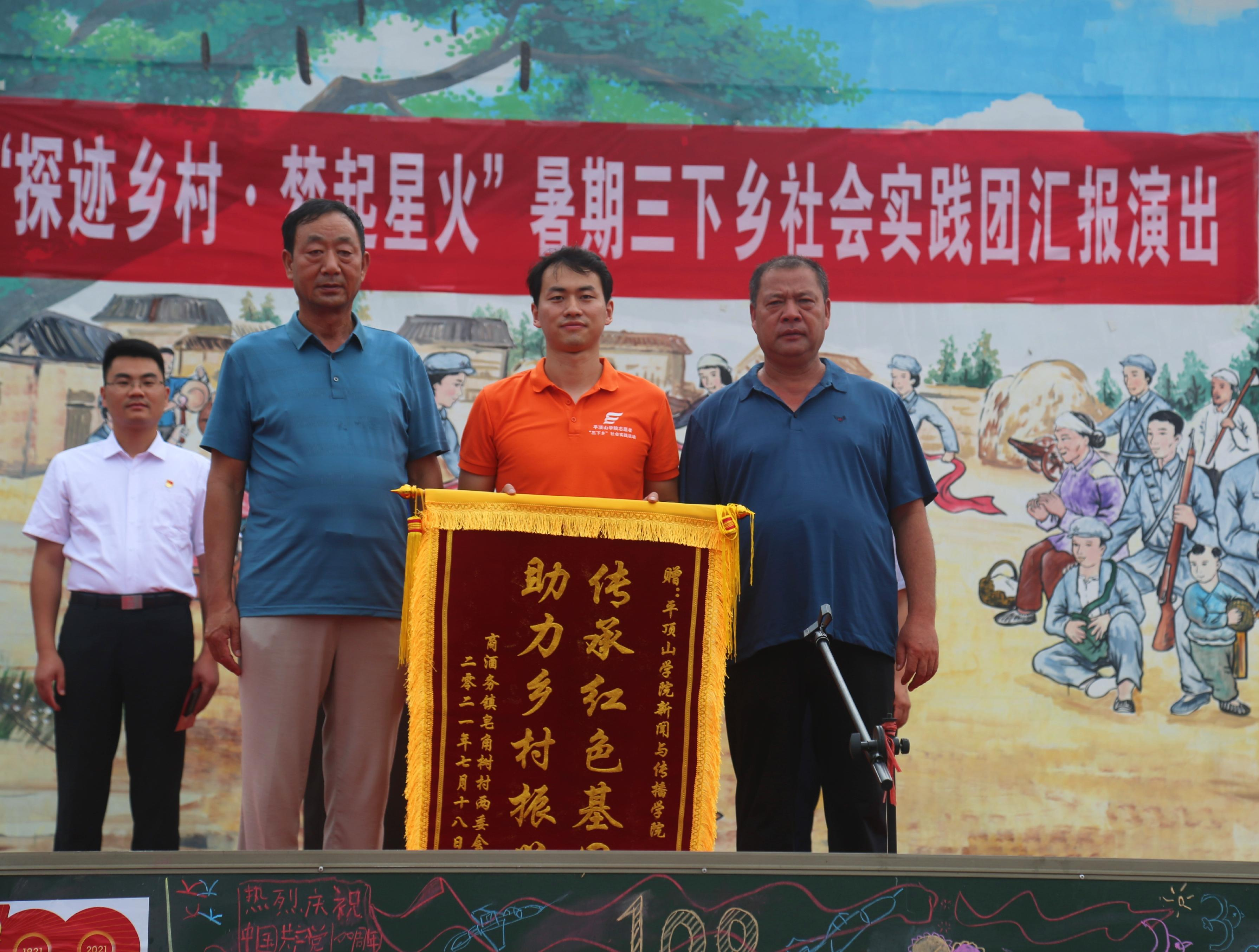 7月18日上午,beats365唯一官网2021暑期“三下乡”社会实践团汇报演出于皂角树文化广场成功举办,beats365唯一官网副经理娄艳阁、团委书记苏小玲、团委副书记焦乐晓,商酒务镇镇长王晓巍、皂角树村党支部书记王朝臣等领导及实践团全体成员、皂角树村百余名父老乡亲和孩子们参与了此次活动。副经理娄艳阁发言,对皂角树村提供给beats365唯一官网学子一个实践平台表示感谢,王朝臣书记也对实践团成员们对本村的红色革命精神、产业结构进行深度调研,拍摄宣传片表示感谢,并对beats365唯一官网授予锦旗“传承红色基因,助力乡村振兴”。