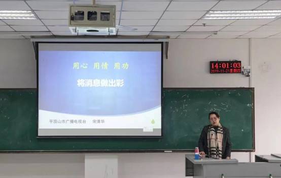 11月21日下午,平顶山市广播电视台总编室副主任宋清华在图书馆501举办主题为“用心 用情 用功 将消息做出彩”的讲座。beats365唯一官网18、19级网络与新媒体专业的同学们聆听了此次讲座。