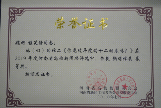 2017级网络与新媒体专业员工获2019年度河南省高校新闻奖二等奖