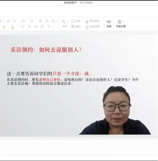 讲座中,李笑梅老师分别从“采访步骤”“采访前的准备”“采访提纲的设计”“采访中容易遇见的问题”“如何解决问题”“采访中如何打开受访者的话匣子”“在采访中遇见的案例以及解决方法”等七个方面展开讲解。李笑梅老师结合自身采访时的所见所闻,提到采访需明确采访目的,并以“敏锐”为关键词表明,作为新闻传媒人,同学们要保有敏锐的新闻直觉,深入了解事件;在介绍预备采访的相关知识时,李笑梅老师强调,应立足于“诚”,真诚面对被采访人,并通过自己以“诚”获得采访机会的例子,让同学们深刻体会到“诚”的重要性。李笑梅老师指出,一个好的采访者首先是一个好的倾听者,在尊重采访对象的同时,在采访过程中更要与被采访人产生共情,这样才能得到更加真实、自然的采访。